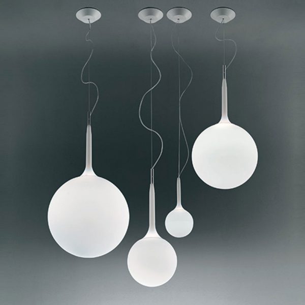 Artemide Castore 42 lampada a sospensione; design Michele De Lucchi, Huub Ubbens.  Sospensione con rosone e stelo in materiale termoplastico, diffusore in vetro soffiato diametro 42 cm. Possibilità di utilizzare lampadine alogene eco o LED. Una sfera in vetro soffiato che si adatta benissimo in qualsiasi ambiente, disponibile in altre tre dimensioni più piccole. Della stessa famiglia in abbinamento abbiamo le lampade da tavolo da terra e plafoniera. Codice prodotto 1051010A