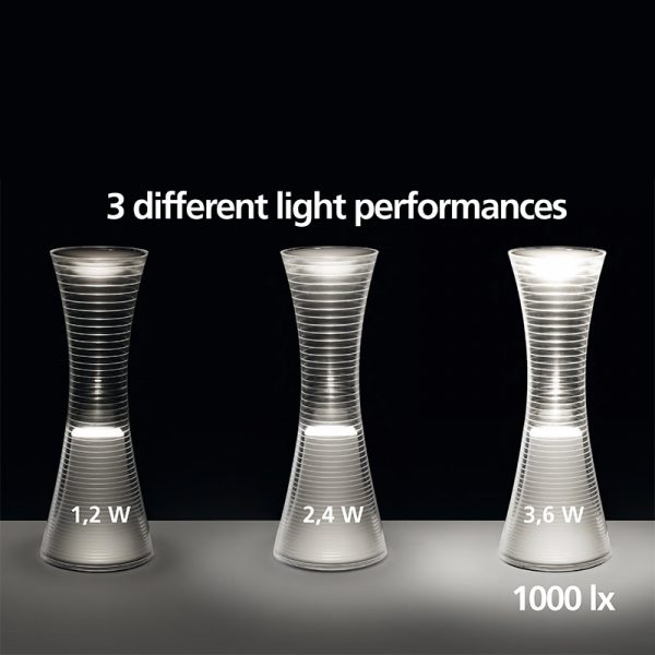 Artemide Come Together lampada da tavolo LED; Carlotta de Bevilacqua designer. Materiali: metacrilato e alluminio. Lampada da tavolo con LED, portatile e ricaricabile con ben 8 ore di autonomia. La forma è modellata per ragioni ottiche e di prensilità, ottica trasparente con gradienti per trasportare e distribuire la luce. Tre colori di tendenza: bianco, alluminio e rame lucido. Estremamente leggera e portatile (solo 400 gr), N.1 LED totale 3,6w 360lm 3000K con possibilità di regolare la luce LED in tre differenti step (1,2W, 2,4W, 3,6W). Batteria ricaricabile tramite USB, durata della batteria 8 ore con 3 ore di ricarica rapida.