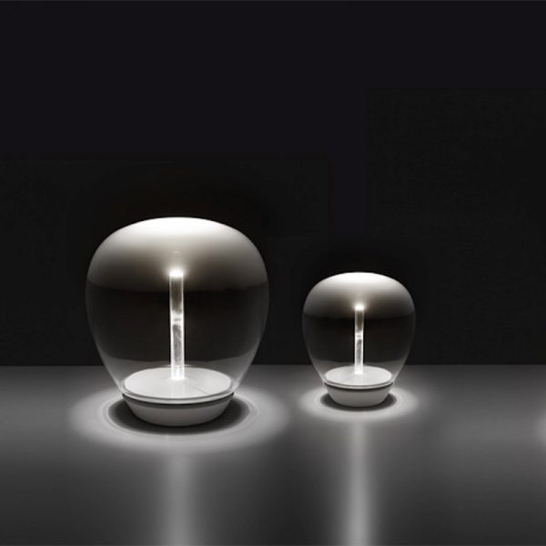 Artemide Empatia 36 lampada da tavolo a LED; Carlotta de Bevilacqua, Paola Di Arianello designer. Materiali: struttura in alluminio verniciato e vetro soffiato. LED 26W – 3000K – 1273lm. – incluso. Empatia 36 un connubio tra la grande tradizione del vetro soffiato e la LED technology di Artemide. La lavorazione artigianale rende questa lampada a tutti gli effetti un pezzo unico. Le trasparenze e le opacità sono dosate in modo da ottenere un vetro che diffonde e riflette la luce senza abbagliare, senza perdere in efficienza. La luce viene controllata e guidata al diffusore in vetro attraverso un light pipe trasparente dal bassissimo coefficiente di assorbimento. Disponibile in altre due dimensioni più piccole, Empatia 16 e Empatia 26. Completa di regolatore di intensità luminosa – touch dimmer. Codice prodotto: 1821010A