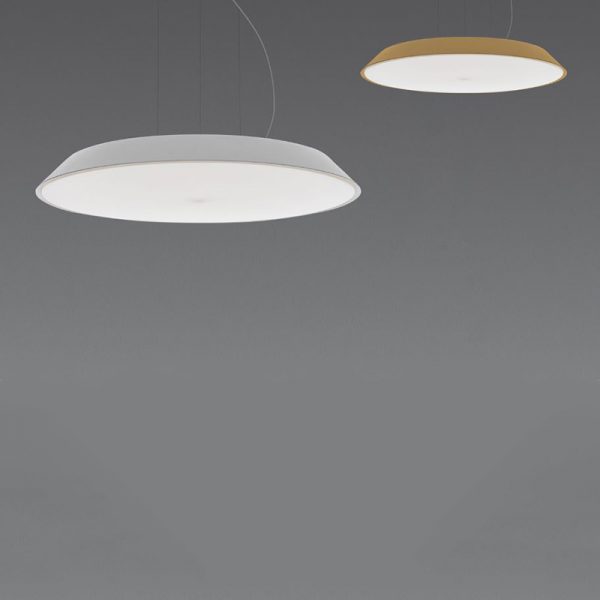 Artemide Febe lampada a sospensione LED, essenziale e pulita di minimo spessore con cornice bianca o grigio tortora.