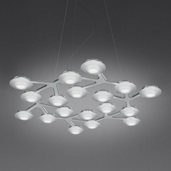 Artemide LED NET lampada a sospensione circolare LED; Michele De Lucchi, Alberto Nason designer. LED 3000K (luce calda) 43W 2520lm incluso, emissione di luce diretta. Materiali: lastra di alluminio satinato su cui si sviluppa un circuito stampato di supporto ai Led. Ogni Led è dotato di lente in metacrilato trasparente e di porta lente in metacrilato satinato. Colore bianco lucido (RAL 9003). Ideale per illuminare la zona giorno posizionato sopra il tavolo. Codice prodotto: 1575050APP