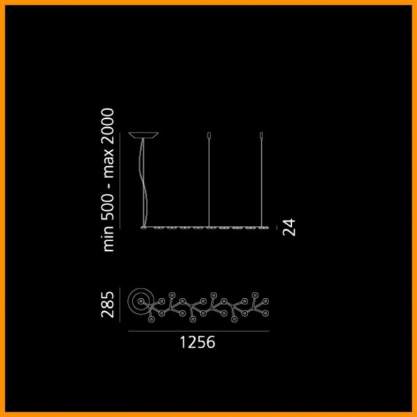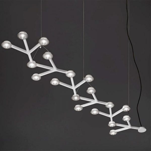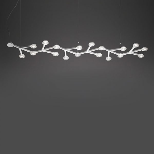 Artemide LED NET sospensione lineare 125 LED; Michele de Lucchi, Alberto Nason designer. Materiali: lastra di alluminio satinato su cui si sviluppa un circuito stampato di supporto ai Led, colore bianco lucido. Ogni Led è dotato di lente in metacrilato trasparente e di porta lente in metacrilato satinato. Emissione diretta della luce LED, 45W (luce calda) 3000K 2530lm. incluso. Adatta ad illuminare il tavolo della zona pranzo o della cucina, corridoio, lo studio. Codice prodotto: 1578050APP