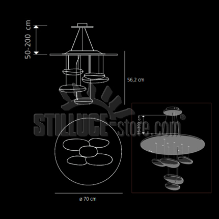• Dimensioni: Ø 70 cm. h. 56,9 cm. - altezza min. 96 cm. max 262 cm.