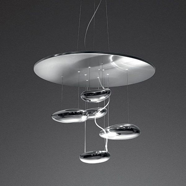 Artemide Mercury mini LED lampada a sospensione; Ross Lovegrove designer. Materiali: struttura in acciaio inox satinato e alluminio verniciato. Corpi illuminanti in alluminio cromato. Pendenti in plastica cromata. Riflettore in acciaio inox. Una lampada che consiste in una serie di grandi ciottoli fluttuanti sotto un disco semplice e moderno. A loro volta, i ciotoli si riflettono l’un l’altro, facendo rimbalzare la luce tra le loro lisce superfici biomorfiche. Durante il giorno l’oggetto è una scultura che riflette le dinamiche della luce naturale e il movimento delle persone attorno a sé. LED 29W 2700 / 3000K incluso. Codice prodotto. 1477W10A 2700K – 1477110A 3000K.