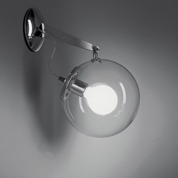 Artemide Miconos lampada parete di Ernesto Gismondi designer. Materiali: vetro soffiato soffiato trasparente d. 25 cm. e acciaio. Lampada a parete composta da un diffusore in cristallo e struttura cromo lucido e nel nuovo modello con struttura in ottone satinato. Coordinata con i modelli da soffitto e sospensione. Codice prodotto: A020100 cromo lucido – A020110 ottone satinato.