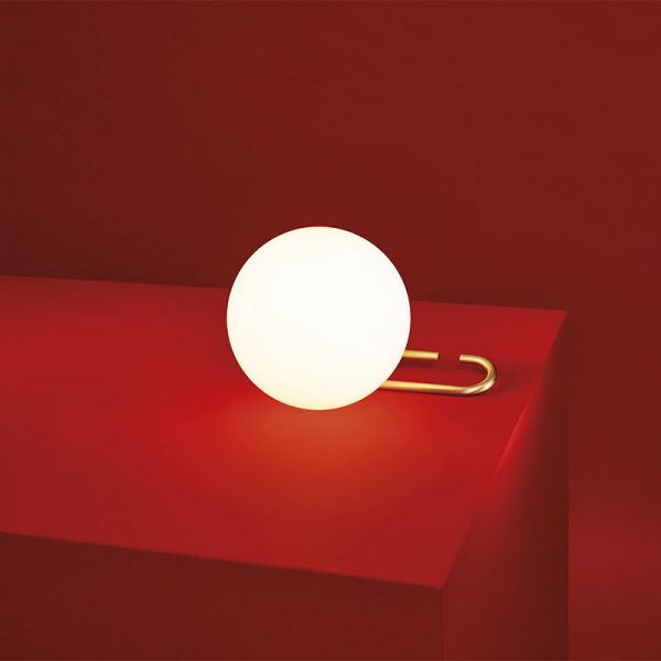 Artemide NH1217 lampada da tavolo LED; Neri&Hu designer. Materiali: vetro soffiato bianco e ottone spazzolato. Lampadina LED E14 esclusa. Una lampada pratica e semplice, è possibile appoggiarla, appenderla orientare il diffusore liberamente, può assumere diverse posizioni. La sfera è in vetro soffiato bianco, e scorre lungo un anello in ottone spazzolato che diventa una base di appoggio, un gancio per appendere la lampada a parete, una maniglia per interagire con la luce e poter spostare la lampada nello spazio. Codice prodotto: 1217010A