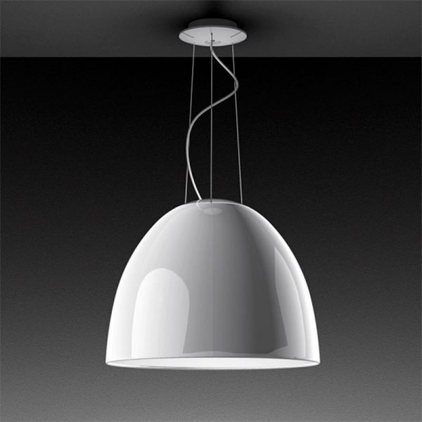 Artemide Nur Gloss lampada a sospensione; Ernesto Gismondi designer. Materiale: alluminio, metacrilato e vetro. Utilizza una lampadina attacco E27 alogena eco o lampadina LED esclusa. Una nuova finitura perfettamente liscia e lucida nel colore bianco che conferisce eleganza al classico modello Nur. Tutte le versioni sono chiuse da un diffusore nella parte inferiore. Codice prodotto: A242100