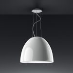 Artemide Nur Gloss lampada a sospensione; Ernesto Gismondi designer. Materiale: alluminio. metacrilato e vetro. Utilizza una lampadina attacco E27 alogena eco o lampadina LED esclusa. Una nuova finitura perfettamente liscia e lucida nel colore nero che conferisce eleganza al classico modello Nur. Tutte le versioni sono chiuse da un diffusore nella parte inferiore. Codice prodotto: A242110