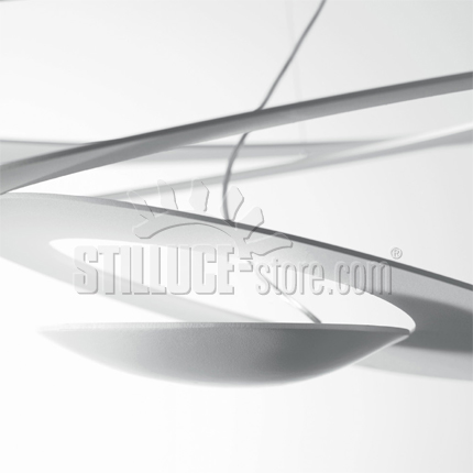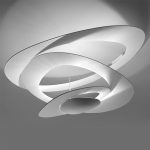 caArtemide Pirce mini soffitto LED; Maurizio Scutellà designer. Lampada a soffitto versione LED, ampliamento di gamma della serie Pirce, disponibile in dimensione mini, corpo lampada cm.67. Da un disco sottile di aprono volute fluttuanti, che ricadono morbidamente verso il basso, creando magici effetti di forma di luce.Materiali: alluminio verniciato bianco. Codice: 1255110A LED 44W 3000K – 1255W10A LED 44W 2700K.