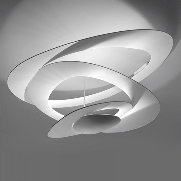Artemide Pirce lampada a soffitto alogena in alluminio verniciato nel colore bianco. Da un disco sottile si aprono volute fluttuanti, che ricadono morbidamente verso il basso, creando magici effetti di forma e luce.