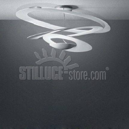 Artemide Pirce lampada a soffitto alogena eco; Giuseppe Maurizio Scutellà designer. Materiali: alluminio verniciato nel colore bianco. Lampadina alogena eco R7s 330W 2950lm o lampadina LED dimmerabile, esclusa. Da un disco sottile si aprono volute fluttuanti che creano magici effetti di forma e luce. Una sospensione dalla forma originale, arreda piacevolmente ambienti di media grande dimensione sia classici che moderni, luce indiretta, illumina senza abbagliare. Disponibile anche nella versione a sospensione in diverse dimensioni e da parete, alogena o LED. Codice prodotto: 1242010A
