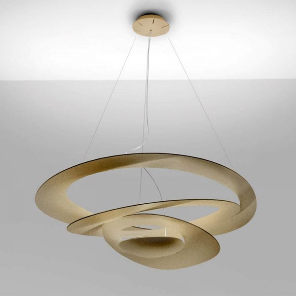 Artemide Pirce sospensione LED colore oro. Da un disco sottile si aprono volute fluttuanti, che ricadono morbidamente verso il basso, creando magici effetti di forma e luce.