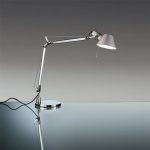 Artemide Tizio, lampada da tavolo a LED; Richard Sapper designer. Materiali: policarbonato verniciato, bracci e testa orientabili, testa Tizio LED in alluminio verniciato colore nero. LED total power 8W 3000K 468lm. CRI90 – incluso per una emissione di luce diretta e orientabile. Regolatore d’intensità luminosa – microswitch dimmer – incluso. Codice prodotto: A009210 3000K.