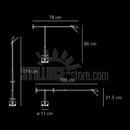 • Dimensioni: base Ø 11 cm. altezza min. 31,5 max 119 cm. - lungh. min 78 max 108 cm.