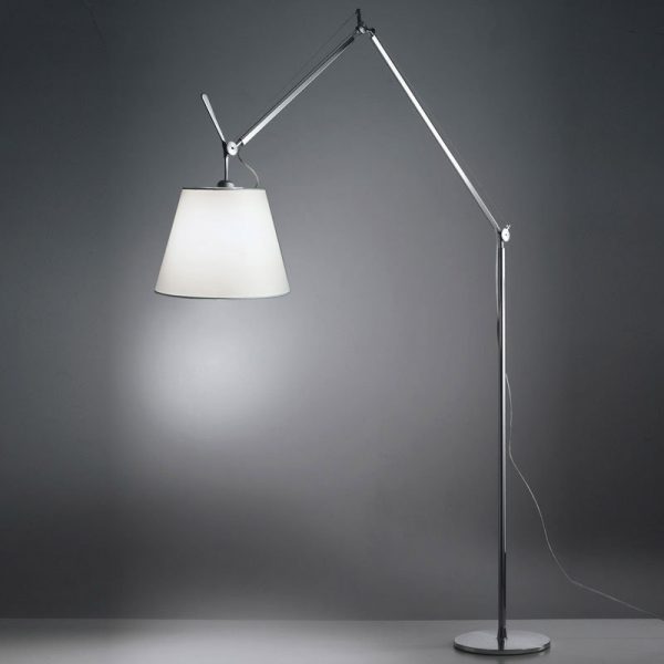 Artemide Tolomeo Mega lampada da terra LED con dimmer. Base in alluminio lucidato; struttura a bracci mobili in alluminio lucidato, diffusore in carta pergamena o seta, supportato da materiale plastico; dimmer su cavo.