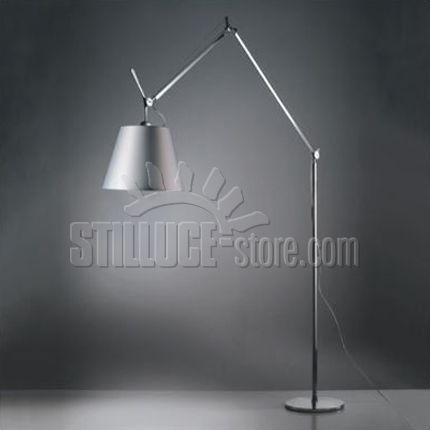 Artemide Tolomeo Mega lampada da terra con interruttore on/off, coordinata con i modelli a morsetto, parete e sospensione. Colori: struttura alluminio lucido, diffusore grigio in raso di seta d. 32 cm.