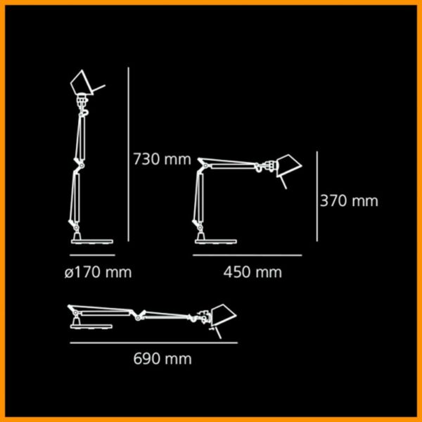 Artemide Tolomeo micro lampada da tavolo; Michele De Lucchi Giancarlo Fassina designer. Materiali: diffusore orientabile in alluminio anodizzato opaco, bracci mobili e base tavolo in alluminio lucidato, snodi e supporti in alluminio brillantato, sistema di equilibratura a molle. Colore alluminio, bianco lucido, nero. Tolomeo una lampada conosciuta in tutto il mondo come simbolo del design Made in Italy, leggera ma allo stesso tempo robusta, i bracci sono mobili e il diffusore è orientabile in qualsiasi direzione, completa una piccola scrivania, è perfetta sui comodini. Attacco della lampadina E14 per poter utilizzare lampadine alogene eco 42W (42W = 60W), basso consumo o led. Codice prodotto: A011800 alluminio – A011830 nero- A0011820A bianco.