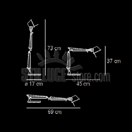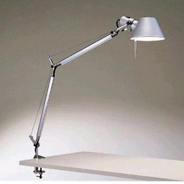 Artemide Tolomeo micro LED morsetto; designer Michele De Lucchi e Giancarlo Fassina. Materiali: alluminio lucidato e alluminio anodizzato opaco. LED integrato 9W 3000K – incluso. Il diffusore in alluminio anodizzato opaco è orientabile, gli snodi, il morsetto, i bracci mobili con un sistema di equilibratura a molle sono in alluminio lucidato. L’apparecchio è dotato di un dimmer per la regolazione dell’intensità luminosa. L’accensione avviene tramite un breve tocco nella parte centrale dell’interruttore posto sul cavo di alimentazione. Codice prodotto: A010300 + A004100 colore alluminio.