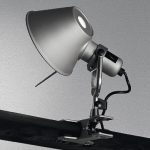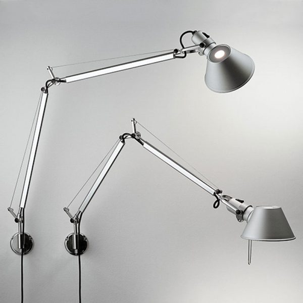 Tolomeo micro Led + attacco parete, Michele De Lucchi e Giancarlo Fassina Designer. Struttura a bracci mobili in alluminio lucidato, diffusore in alluminio anodizzato opaco; snodi e supporti in alluminio brillantato, sistema di equilibratura a molle. L’Apparecchio è dotato di un dimmer sul filo per la regolazione dell’intensità luminosa e di supporto a parete. Codice prodotto: A010300+A025150