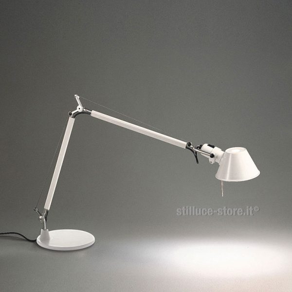 Artemide Tolomeo mini lampada da tavolo; Michele De Lucchi e Giancarlo Fassina designer. Materiali: base e struttura in alluminio anodizzato e alluminio lucidato, diffusore in alluminio anodizzato opaco orientabile in tutte le direzioni, snodo in alluminio brillantato con sistema di equilibratura a molle. Colore alluminio, bianco o nero. Lampadina alogena eco attacco E27 max 1 x 77W o LED 1 X 8W esclusa. La lampada ideale per il soggiorno, lo studio, la camera dei ragazzi. Codice prodotto: A005910+A008600 alluminio – cod. A005940+A008610 nero – cod. A005920+A008620 bianco.