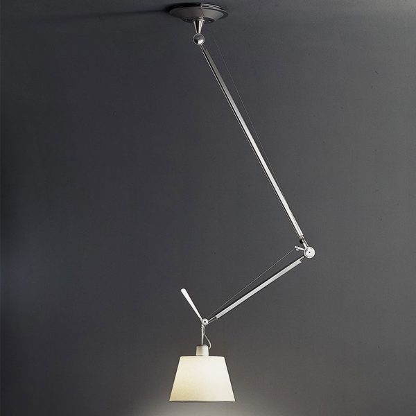 Artemide Tolomeo sospensione decentrata; Michele De Lucchi e Giancarlo Fassina designer. Lampada a sospensione con struttura e bracci mobili in alluminio lucidato, snodi in alluminio brillantato, diffusore in carta pergamena o raso di seta nel diametro 24, 32 o 36 cm. Lampadina: E27 LED o alogena max 150W (solo nel diffusore d. 32 e 36 cm) esclusa. Adatta ad illuminare il tavolo del soggiorno, un piano di lavoro, la scrivania, il braccio snodato permette di arrivare con la luce sul piano di lavoro anche in caso di punto luce non perfettamente centrato.