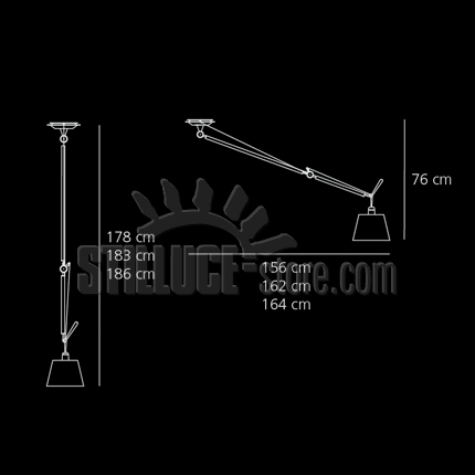• Dimensioni: Altezza 80 cm. - diametro 20 cm - altezza max dal soffitto 181 cm - Estensione max in larghezza 154 cm.