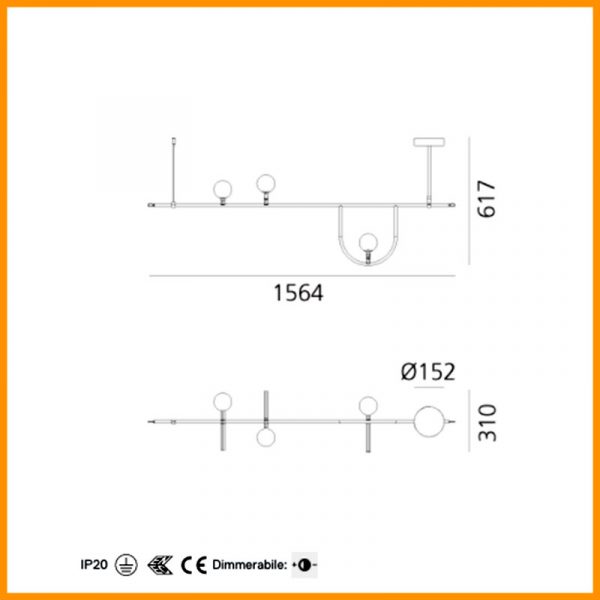 • Dimensioni: Lunghezza cm. 156 - larghezza cm. 31- diametro base cm. 15,2 - Altezza min dal soffitto cm. 61,7
