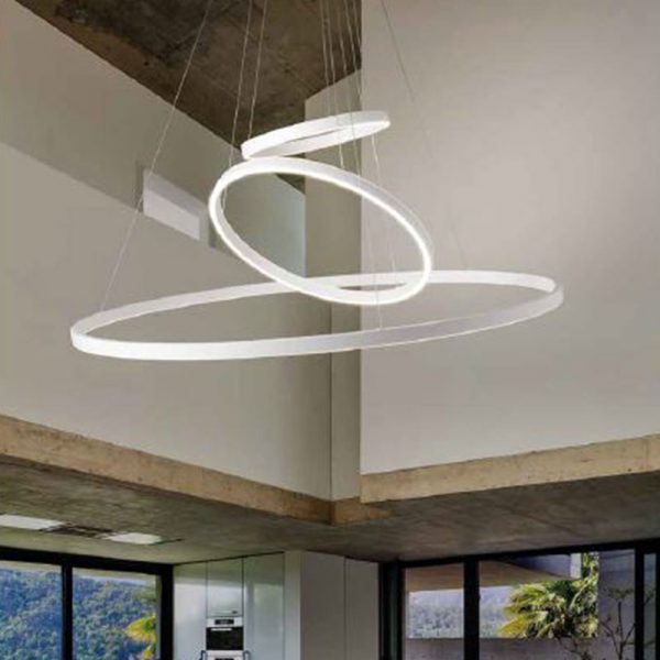 Braga Illuminazione Loop lampada a sospensione composta da tre anelli. Struttura in metallo verniciato bianco. La composizione è composta da un anello a luce diretta d. 50 cm, un anello a luce diretta d. 90 e un anello a luce diretta e indiretta d. 120 cm. LED Totali 224W 12375lm 3000K. A richiesta è possibile richiedere la colorazione di luce 2700K (più calda) o 4000K (diurna) ed è possibile richiedere varianti di dimensioni anelli e colori (bianco, foglia oro o foglia argento, nero, corten, grigio tortora, ruggine o ferro)