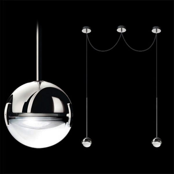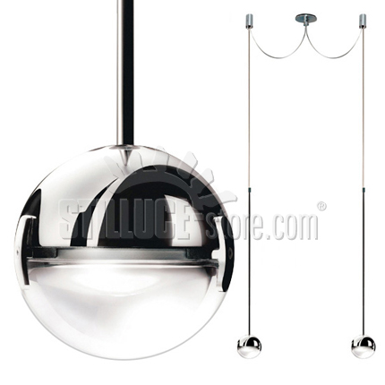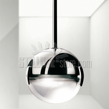 Cini e Nils Convivio New LED lampada a sospensione a due luci, design di Luta Bettonica e Mario Melocchi. Una piccola sfera (diametro 11 cm) metà lente e metà metallo cromato o nichel satinato, studiata per illuminare con luce uniforme e vivace sia un grande tavolo da pranzo che un piccolo tavolo da bar, senza abbagliare chi sta intorno. Una cupola di luce omogenea che crea un mondo personale ed intimo. Codice prodotto: 1867L cromo – cod 1892L nero opaco.