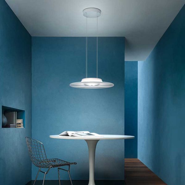 Cini e Nils Fludd sospensione LED, un disco trasparente con mini prismature antiabbaglianti rinfrange la luce emessa e la concentra verso il basso. Alto indice di resa cromatica che garantisce il rispetto della percezione dei colori e una corretta illuminazione.