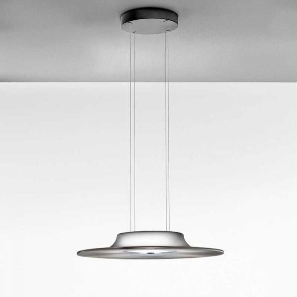 Cini e Nils Fludd sospensione LED; design Alessandro Scandurra. Lampada per interni a luce diffusa dimmerabile a taglio di fase, (a richiesta vocale, Casambi). Un disco trasparente con mini prismature antiabbaglianti, rinfrange la luce emessa dall’elemento diffondente superiore e la concentra verso il basso. La luce schermata e diffusa di Fludd nel modello a sospensione la rende adatta per installazioni a qualsiasi altezza. LED integrato da 30W 3800lm. con alto indice di resa cromatica (CRI) garantisce il rispetto della percezione dei colori e una corretta illuminazione dell’ambiente. Fludd è disponibile anche nel modello a soffitto. Codice prodotto: 1650