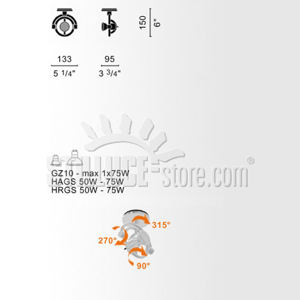 Cini e Nils MiniFariuno, lampada da parete o soffitto, Franco Bettonica e Mario Melocchi designers, 1998. Apparecchio in zama orientabile in tutte le direzioni, con luce diretta d’accento. Lampadina LED inclusa. Colore Cromo o Argento. Codice prodotto: Cromo cod. 960L – Argento cod. 961L