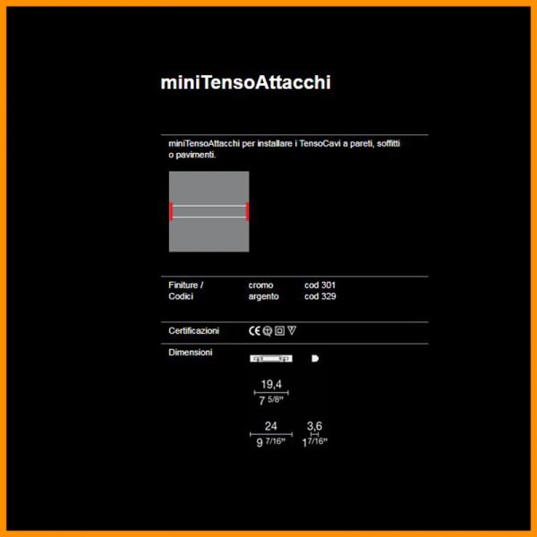 Cini e Nils Tesata MiniTenso a tensione di rete (230V), su cavi composta da: TensoCavo trasparente per tesata lunghezza max 10 mt. (cavo 20 mt.), n. 1 MiniTensoAttacchi cromo per alimentazione a parete, n. 3 corpi illuminanti MiniTensoFariuno con finitura argento. MiniTensoFariuno è un faretto orientabile con inclusa lampadina 230V LED GU10 PAR16 beam 36° 2700K 4,6W 350 lm dimmerabile. Una tesata ideale per illuminazione diretta e d’accento sia in ambienti domestici, che lavorativi, corridoi, camera da letto, mansarde.