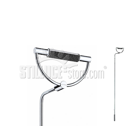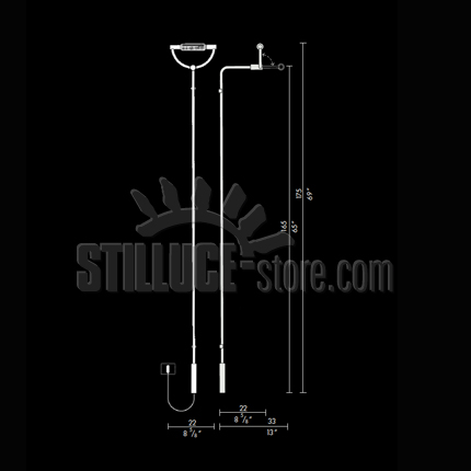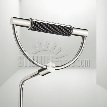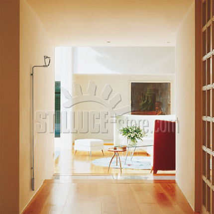 Cini e Nils Gradi lampada da parete con stelo, design di Franco Bettonica e Mario Melocchi, 1990. Lampada per interni con diffusore retinato per illuminazione generale, coordinata con i modelli da terra, soffitto, parete e scrivania. Il corpo illuminante, costituito da un cilindro in vetro ad alta resistenza termica trattato con smalti speciali, assolve da solo le diverse funzioni di riflettore, schermo antiabbagliante e protezione della lampada. La lampadina si sostituisce senza attrezzi. Struttura cromo o nichel satinato con diffusore in vetro retinato.