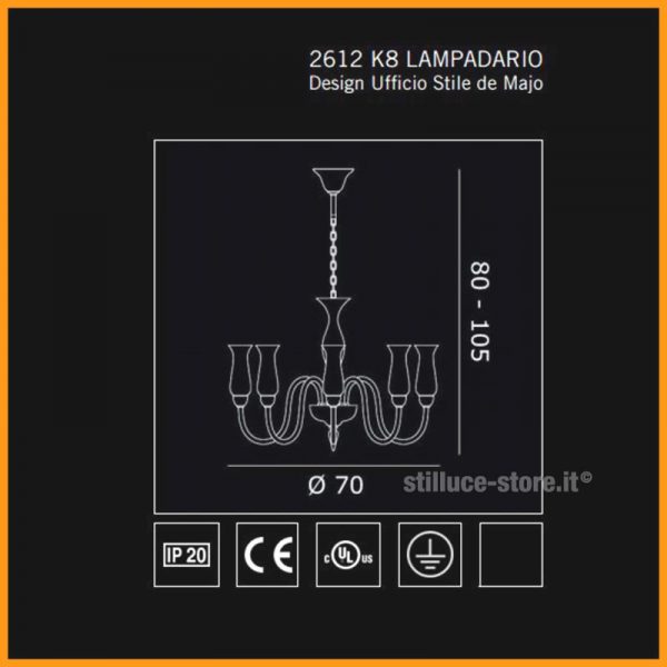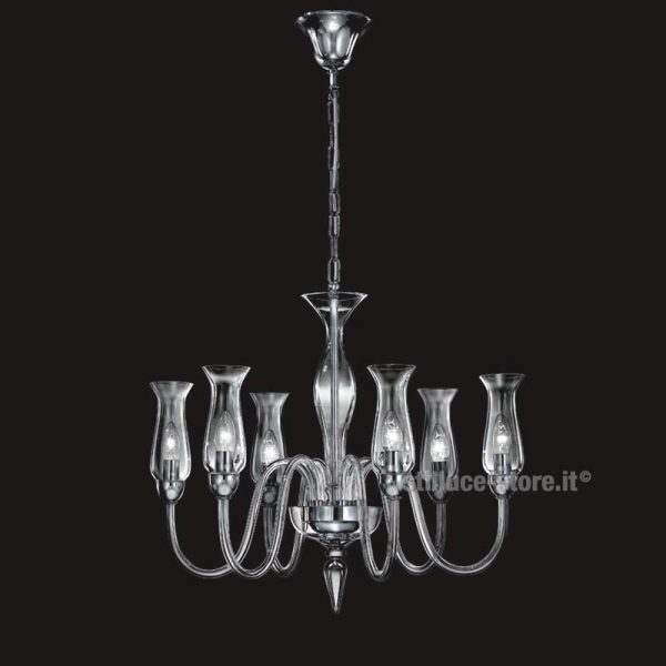 De Majo Illuminazione Lampadario Classico a 8 luci in cristallo soffiato secondo l’antica tradizione dei Maestri vetrai di Murano. Disponibile in due modelli: montatura cromata e vetro in cristallo, montatura dorata e vetro ambra. Predisposto per n. 8 lampadine oliva E14 alogena eco max 42W o nuove lampadine a LED – (escluse). Codice prodotto: 2612 K8
