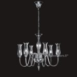 De Majo lampadario 8 luci in cristallo soffiato e lavorato secondo l’antica tradizione di Murano, disponibile con vetri in cristallo e montatura cromo, vetri ambra e montatura dorata.