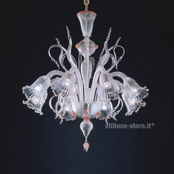 De Majo lampadario 8 luci in cristallo soffiato e lavorato secondo l’antica tradizione di Murano, disponibile in due modelli: montatura verniciata argento con vetro in cristallo decoro rubino oro, montatura verniciata argento con vetro cristallo decoro verde oro.