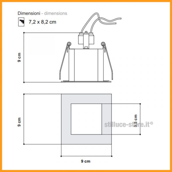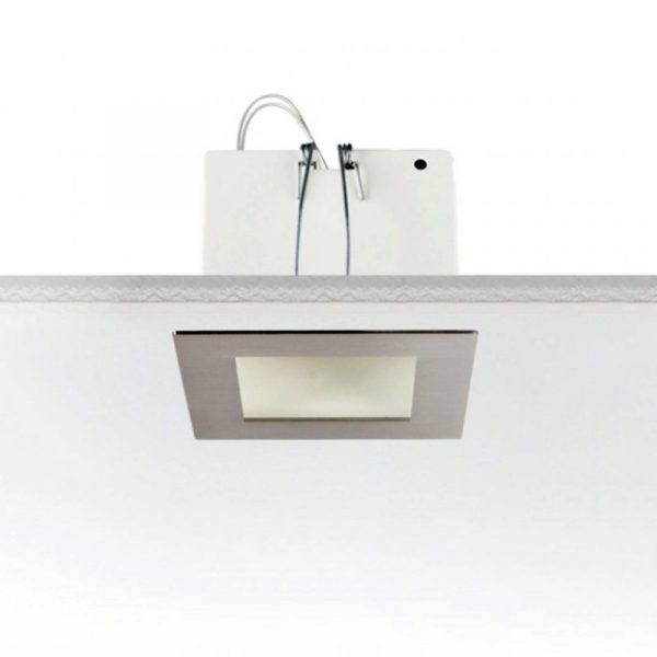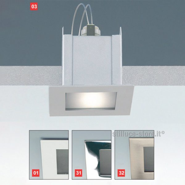Egoluce Edy faretto incasso 230V – IP20 Classe II Foro incasso 7,2 x 8,2 cm. – esterno faretto 9 x 9 cm. nei colori: bianco, cromato, nickel satinato. Accessorio: cod. 0199 vetro satinato extrachiaro con molle di fissaggio (da acquistare separatamente).