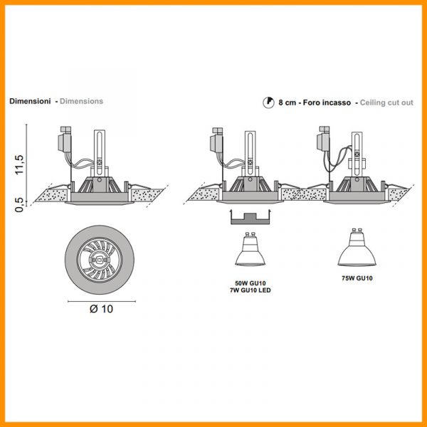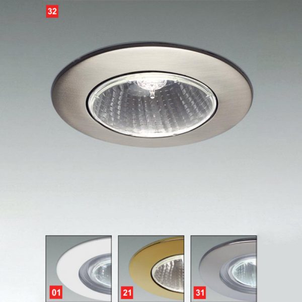 Egoluce EosPiù faretto incasso per soffitto in cartongesso 230V – Classe II doppio isolamento – CE – Foro incasso 8 – esterno faretto 10 cm. Corpo in pressofusione di allumino verniciato nei colori: bianco opaco, dorato lucido, cromato, nichel satinato. Provvisto di portalampade con attacco GU10 per lampadina alogena eco o LED (escluse), luce diretta e puntuale, funziona senza alimentatore collegandosi direttamente alla tensione di rete. Per utilizzare la lampadina LED (diametro 50) utilizzare apposito riduttore di colore grigio fornito con il faretto. Codice prodotto: 6263