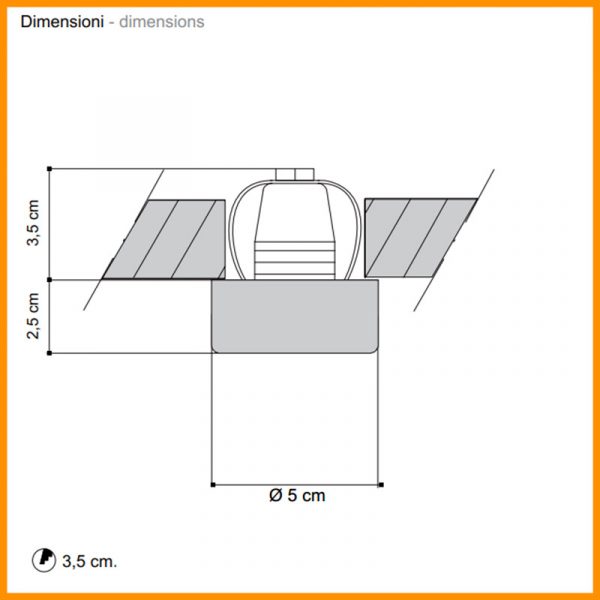 • Dimensioni: foro incasso 3,5 cm. - diametro esterno 5 cm. - altezza ghiera esterna 2,5 cm. - altezza portal. incassato 3,5 cm.