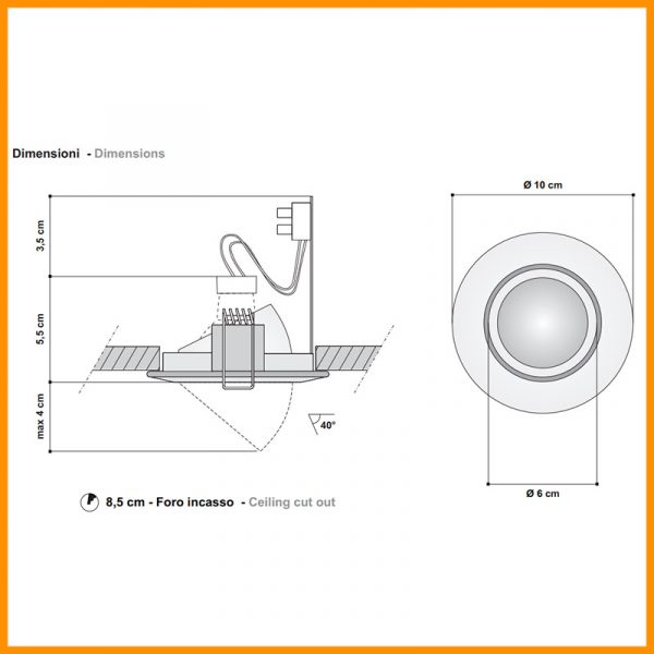 Egoluce Gamma faretto incasso orientabile 40° – IP20 – CE per soffitto in cartongesso – con trasformatore remoto 12V (da ordinare separatamente). Luce diretta e puntuale. Adatto per essere installato anche su superfici normalmente infiammabili. Predisposto per una lampadina dicroica eco 12V GU5,3 max 35W esclusa. L’alimentatore scelto opportunatamente, si può inserire attraverso il foro nel cartongesso e appoggiarlo sullo stesso. Faretto con foro incasso d.8,5 cm. – esterno d.10 cm. Corpo in pressofusione di alluminio verniciato nei colori: bianco, dorato, cromato, nickel opaco. Codice prodotto: 6240