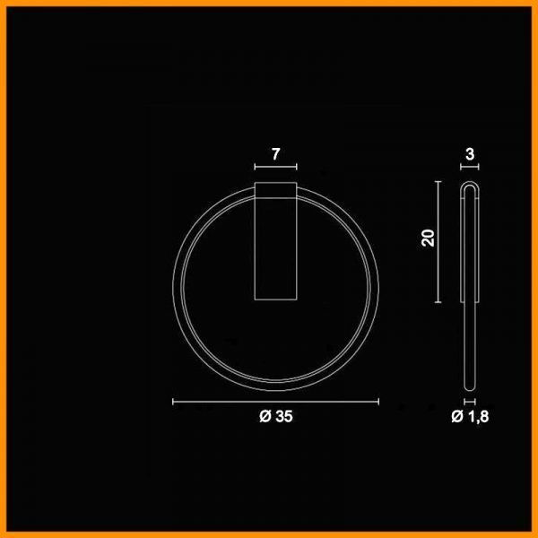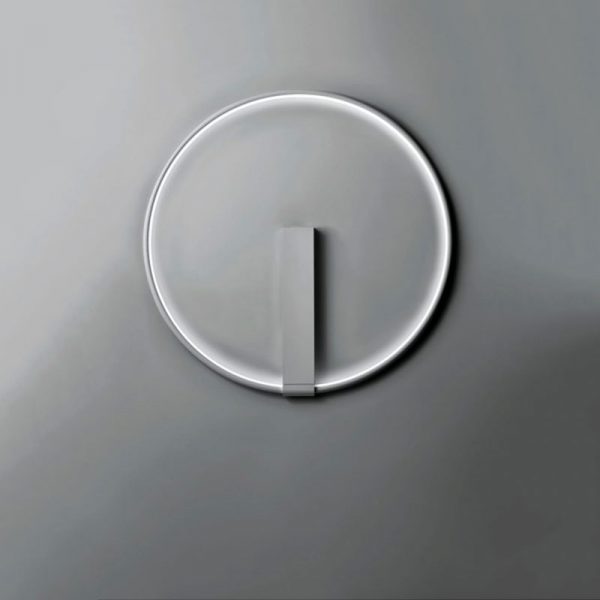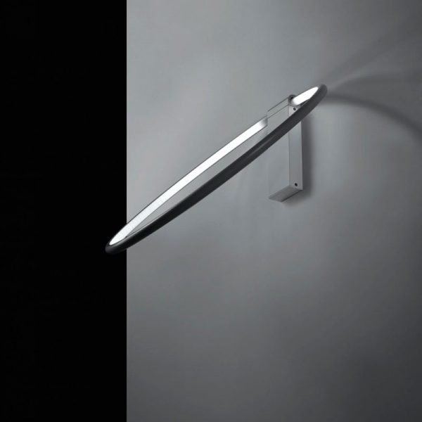 Egoluce Lancia Tonda parete d.35 cm, inclinazione da definire in fase di installazione max 30°. Un anello luminoso con profilo nel colore bianco, nero, dorato satinato o cromato.