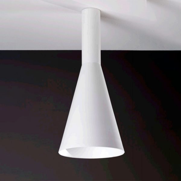 Egoluce Marte lampada a soffitto h. 55 cm; design ABS Studio. Lampada in alluminio con struttura conica nel colore bianco o nero (verniciato goffrato fine). Sorgente LED attacco E27 sostituibile arretrata e non abbagliante (esclusa), la sua forma caratterizza l’emissione della luce a LED  creando luminosi coni d’effetto. A richiesta personalizzabile con differenti finiture di colore. Disponibile anche con lunghezza 40 cm. Codice prodotto: 5652