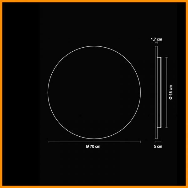 • Dimensioni: diametro 70 cm. - disco altezza 1,7 cm. - altezza totale 5 cm. - base d. 48 cm.