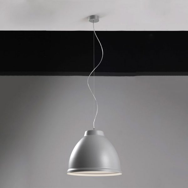 Egoluce Pavillon lampada a sospensione, design ABS Studio 2017. Corpo in alluminio, rosone in ABS stampato e verniciato e cavo alimentazione trasparente. Grazie all’attacco di lampadina E27 è possibile utilizzare lampadine LED. Le finiture disponibili sono il bianco goffrato, sabbia, nero opaco esterno/bianco interno, rosso opaco esterno/ bianco interno. La sua linea semplice, richiama i modelli classici utilizzati nell’illuminazione di capannoni e grandi spazi industriali, oggi trova utilizzo in ambienti moderni sia privati che pubblici. Codice prodotto: 1558