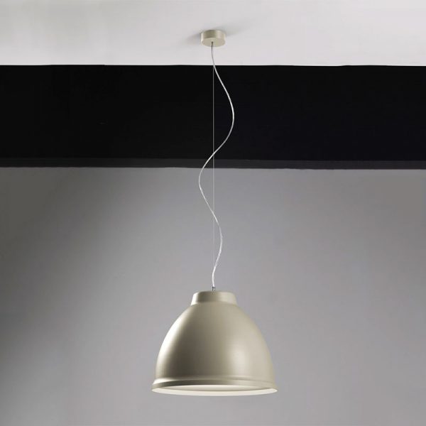 Egoluce Pavillon lampada a sospensione con corpo in alluminio, rosone in ABS stampato e verniciato, cavo di alimentazione trasparente. Disponibile nelle seguenti finiture: bianco goffrato, sabbia, nero opaco esterno/bianco interno, rosso opaco esterno/ bianco interno.