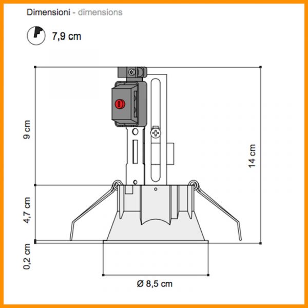 • Dimensioni: Foro incasso d. 7,9 cm. - esterno faretto d. 8,5 cm.