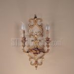 Lampada a parete 2 luci in ferro lavorato a mano. Materiali: ferro lavorato a mano nei colori avorio + foglia oro o foglia oro (vedi 1091.02O). Misure: L. 29 cm. – S. 12 cm. – H. 50 cm.