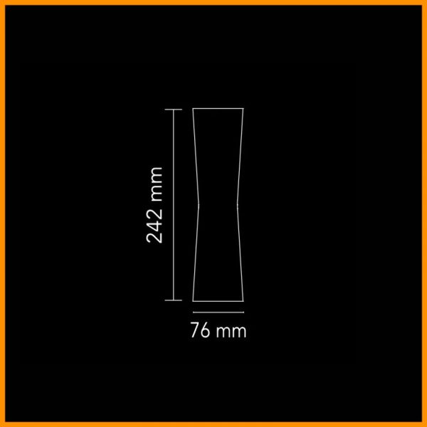 Lampada da parete a luce diretta/indiretta diffusa. Corpo ottenuto tramite pressofusione di alluminio e diffusori in PMMA. Attacco a muro in allumino con cover in PA66. Disponibile versione Indoor verniciata bianco o cromata e versione Outdoor bruno scuro o grigio. Lenti ad alta efficienza appositamente studiate per l’applicazione, non sostituibili. Alimentatore wide-range (100-240V) integrato nel corpo. Livello IP55