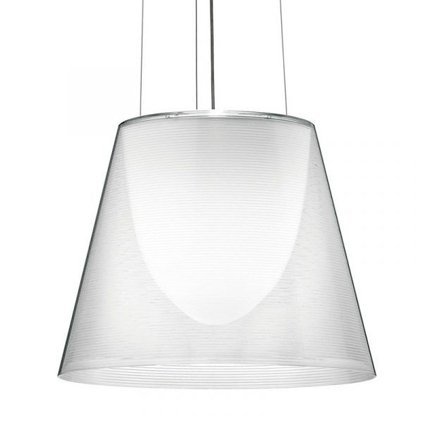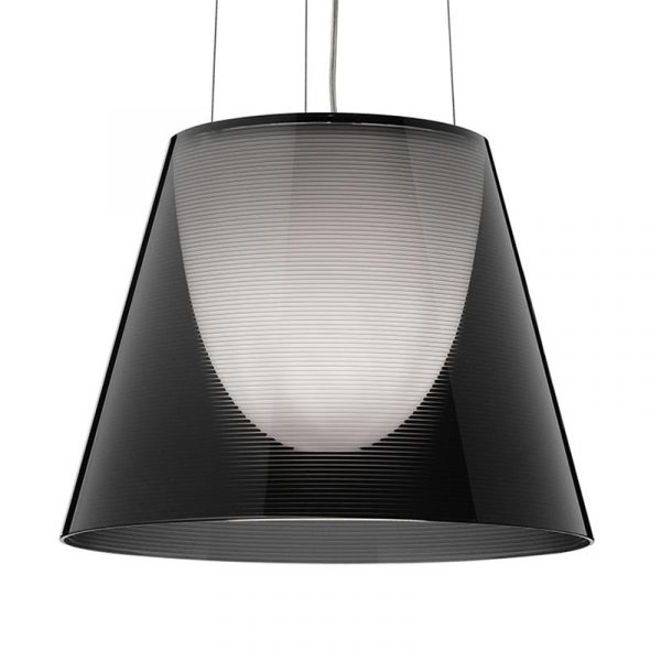 Flos Ktribe S2 lampada a sospensione con diffusore esterno in PMMA disponibile nel colore bronzo, trasparente o fumè. Diffusore interno in policarbonato con finitura bianco opaco.